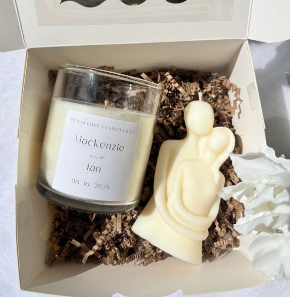 Celebrate love with our signature couple candle paired with a 9oz candle, personalized with a custom label for the couple. Perfect for weddings, anniversaries, or as a heartfelt gift.