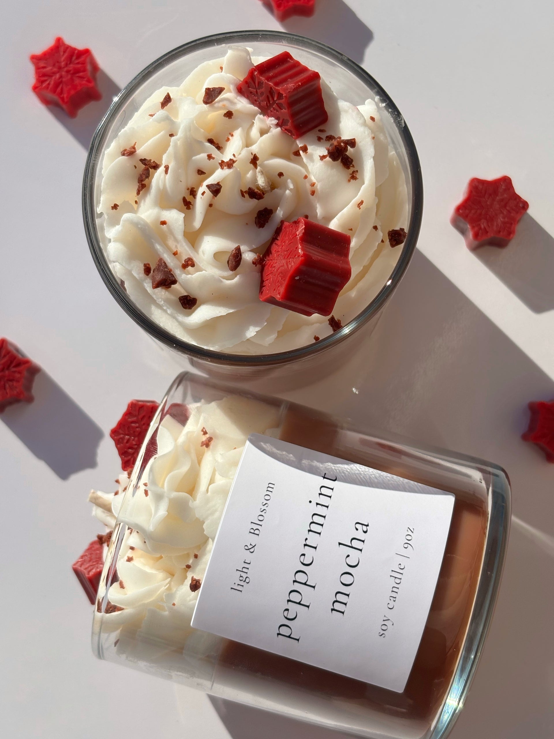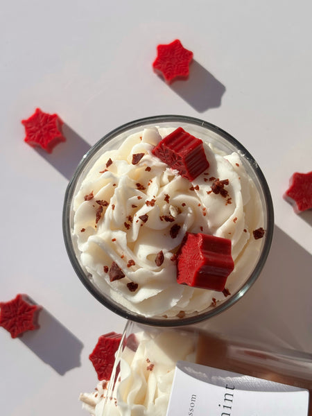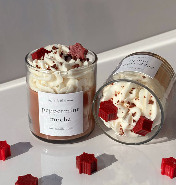 Peppermint Mocha brings the warm comfort of a holiday drink in candle form. It blends creamy chocolate with cool peppermint for a scent that is rich, sweet, and festive. Each candle is hand poured and topped with fluffy whipped wax, chocolate inspired crumbles, and red wax snowflakes for a beautiful holiday finish. It looks like a real peppermint mocha and fills your home with cozy winter sweetness.